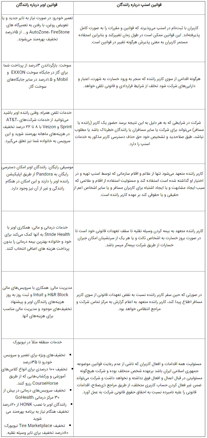 این درحالی است که روی کاغذ، تاکسی اینترنتی اسنپ با همین دو درصد افزایش میزان کمیسیون دریافتی از رانندگان، روزانه ۴۰۰ میلیون تومان و سالانه نزدیک به ۱۵۰ میلیارد تومان به درآمدهای خود اضافه کرده است. هرچند هزینههای دیگری چون مالیات، عوارض و… را نیز باید از این میزان کسر کرد؛ اما این برآوردی است که از میزان افزایش درآمد شرکت «اسنپ» به دست میآید. کافی است نگاهی به این جدول بیاندازید تا ببینید که این شرکت برخلاف دیگر نمونههای موفق در دنیا، تسهیلات کمی برای رانندگان خود در نظر میگیرد و بیشتر به کار اپراتوری مشغول است.